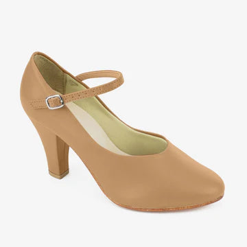 3" heel character shoe with synthetic upper, built-in braces, and leather sole (Rubber sole and heel kit included). Cushioned lining. Buckle strap.