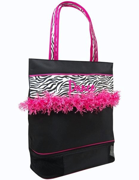 Animal prints just don't go away! Noteworthy for its hot pink fringe trim, this dance tote with zebra print is both fashionable and functional. Dancers everywhere will enjoy the separate shoe compartment to keep shoes apart from clothes, accessories and goodies. The dance tote with zebra print is sure to please with its unique design, ample pockets and a matching Personal I. D. Tag. This striking bag exhibits delicate style, yet it is durable enough for dance class. We think it is a perfect complement to your dance filled life. Mom's will love the fact that it can be wiped clean with a damp cloth.